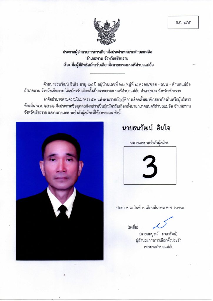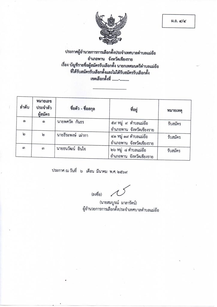 ประกาศผู้อำนวยการการเลือกตั้งประจำเทศบาลตำบลแม่อ้อ เรื่อง ชื่อผู้มีสิทธิสมัครรับเลือกตั้งสมาชิกสภาเทศบาลตำบลแม่อ้อและนายกเทศมนตรีตำบลแม่อ้อลง วันที่ 6 มีนาคม 2569 (ผู้สมัครสมาชิกสภาเทศบาลตำบลแม่อ้อ เขต1)