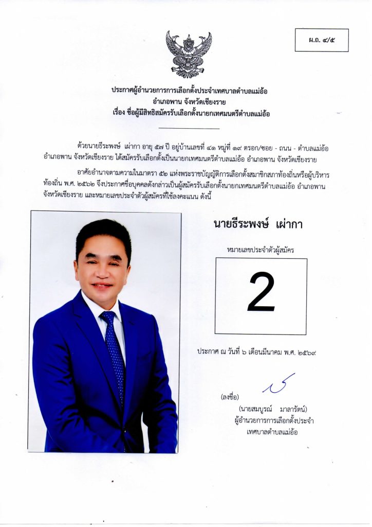 ประกาศผู้อำนวยการการเลือกตั้งประจำเทศบาลตำบลแม่อ้อ เรื่อง ชื่อผู้มีสิทธิสมัครรับเลือกตั้งสมาชิกสภาเทศบาลตำบลแม่อ้อและนายกเทศมนตรีตำบลแม่อ้อลง วันที่ 6 มีนาคม 2569 (ผู้สมัครสมาชิกสภาเทศบาลตำบลแม่อ้อ เขต 2)