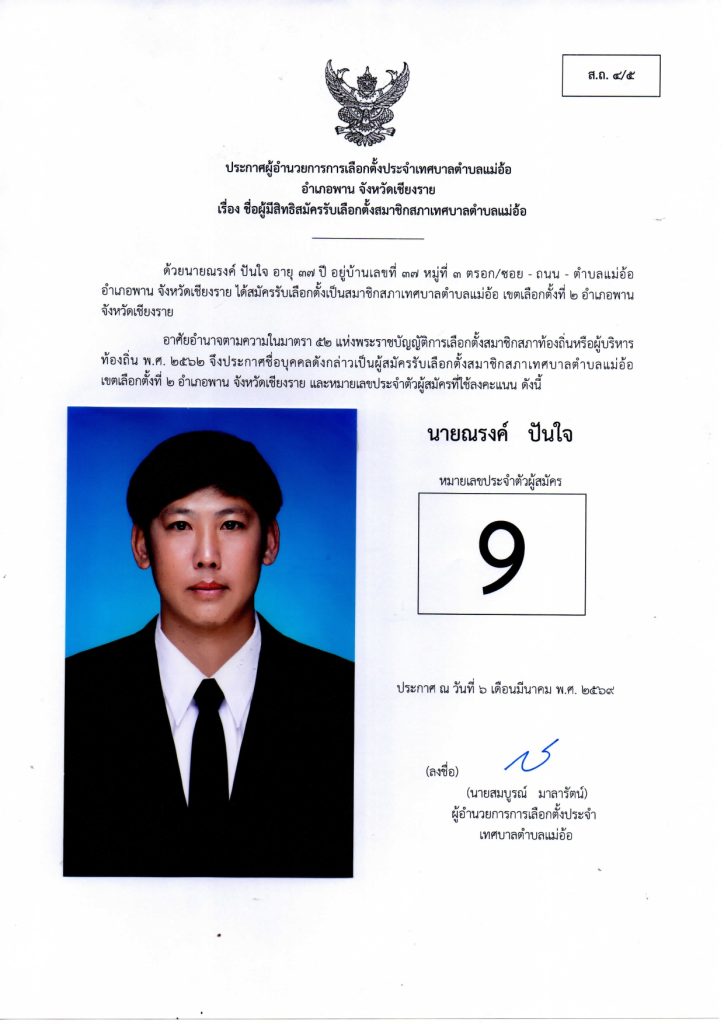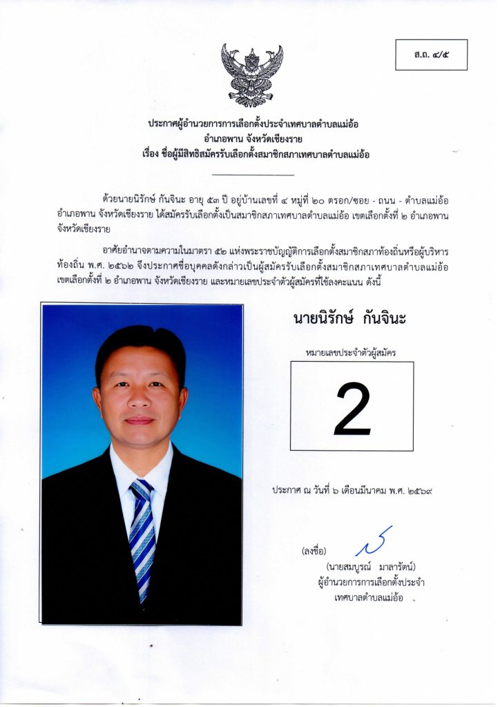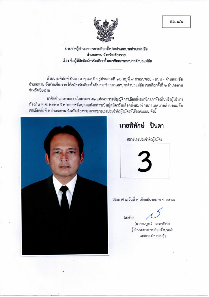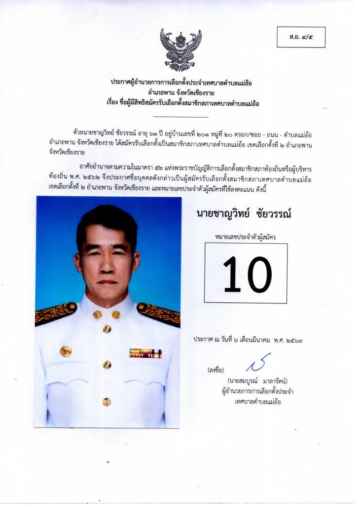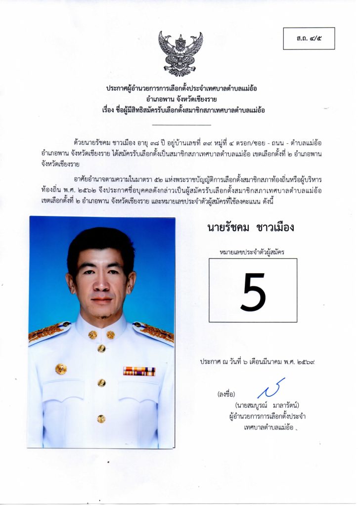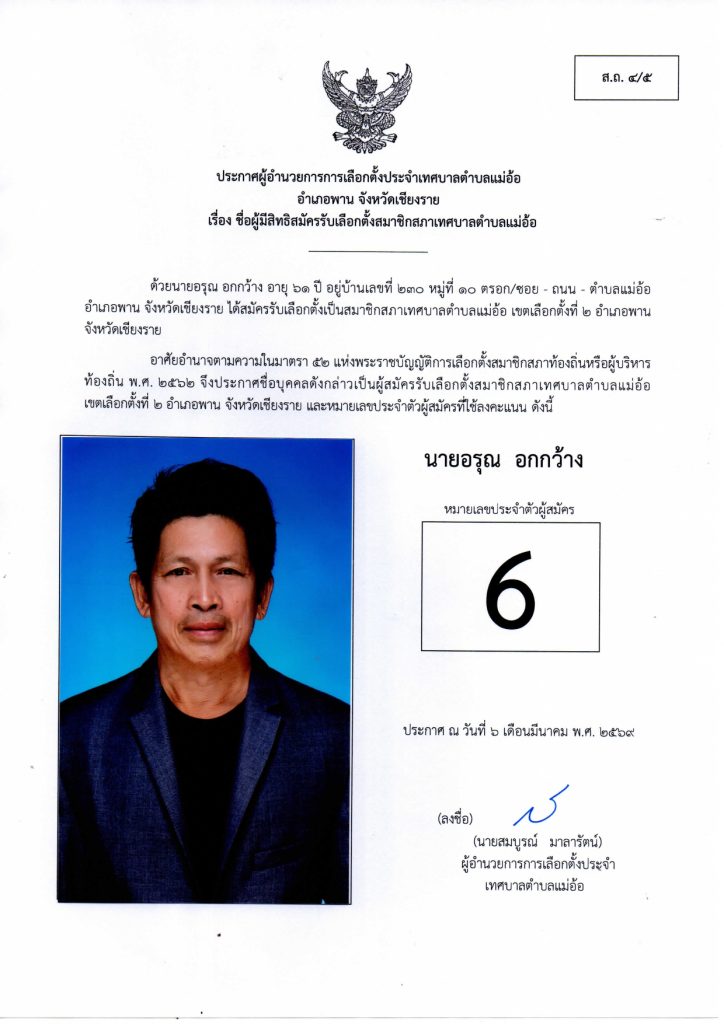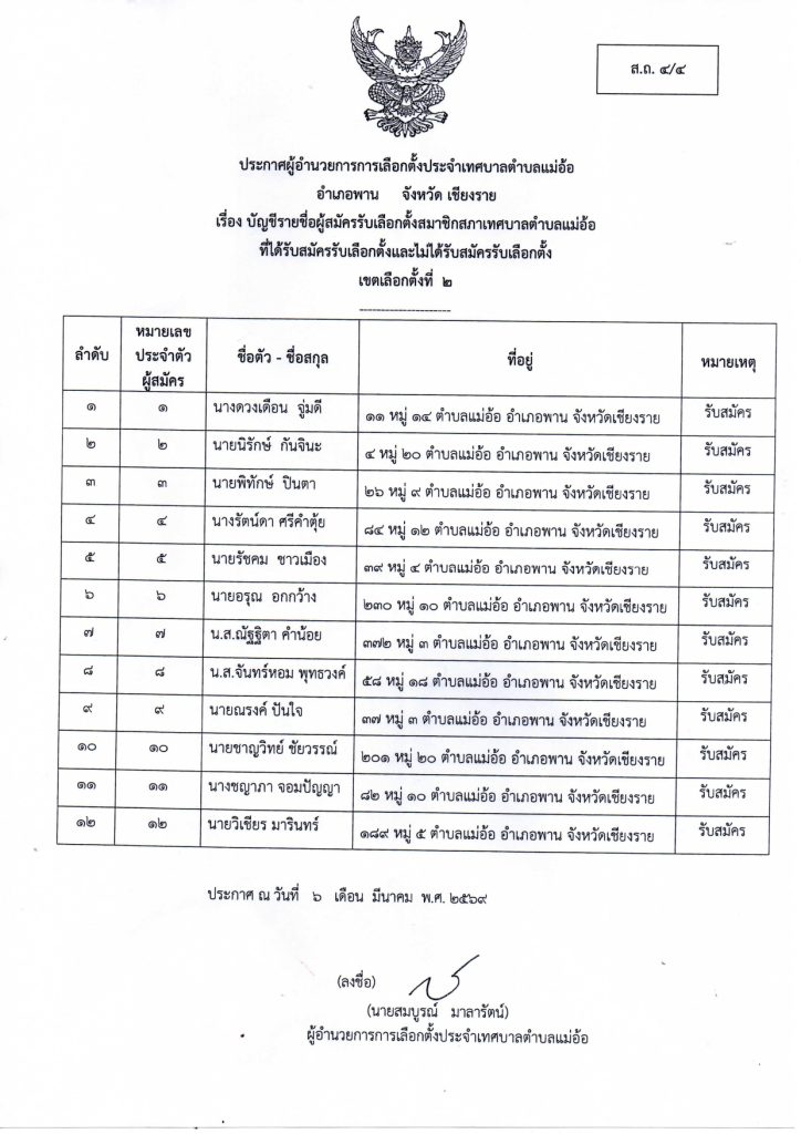 ประกาศผู้อำนวยการการเลือกตั้งประจำเทศบาลตำบลแม่อ้อ เรื่อง ชื่อผู้มีสิทธิสมัครรับเลือกตั้งสมาชิกสภาเทศบาลตำบลแม่อ้อและนายกเทศมนตรีตำบลแม่อ้อลงวันที่ 6 มีนาคม 2569 (ผู้สมัครนายกเทศมนตรีตำบลแม่อ้อ)