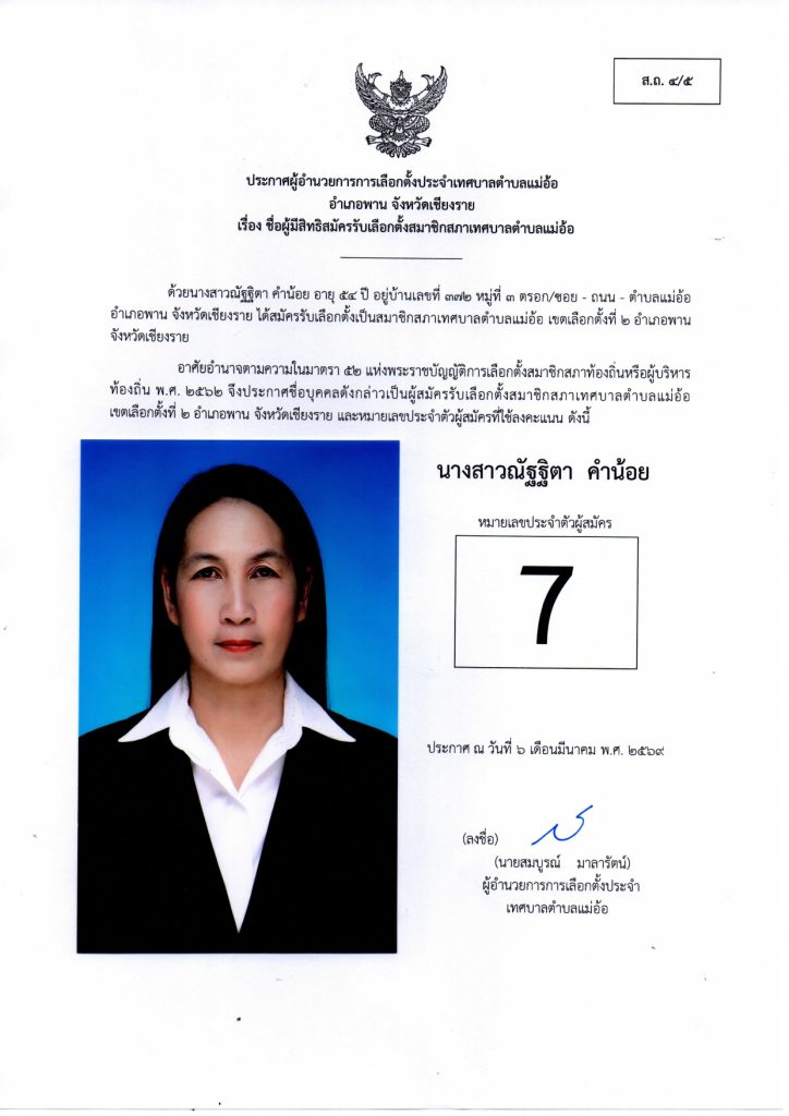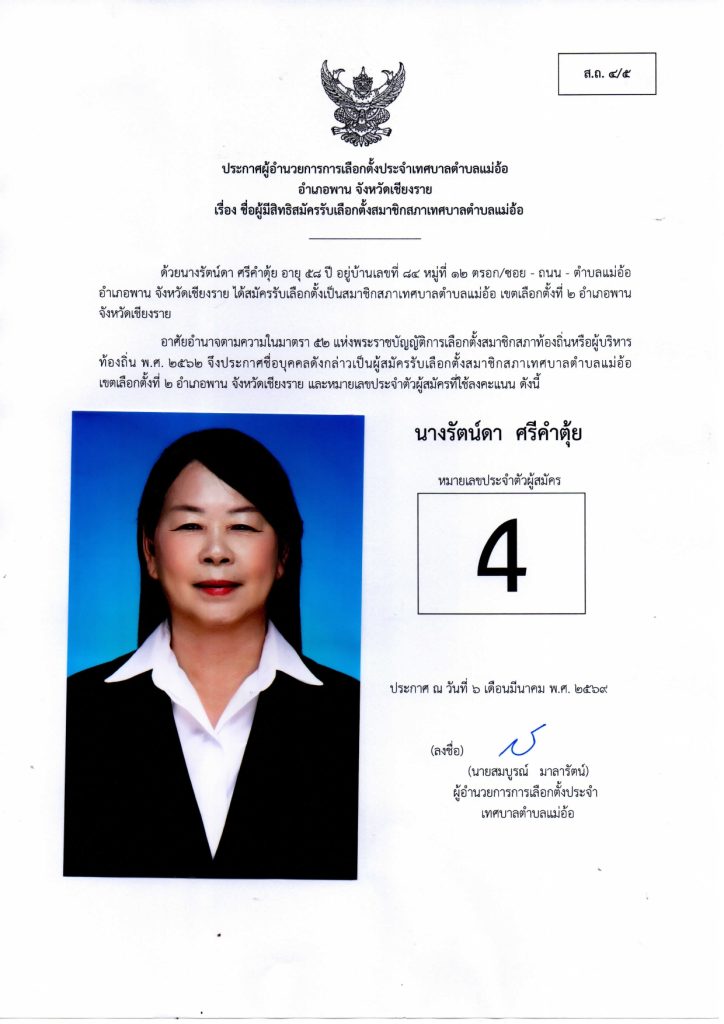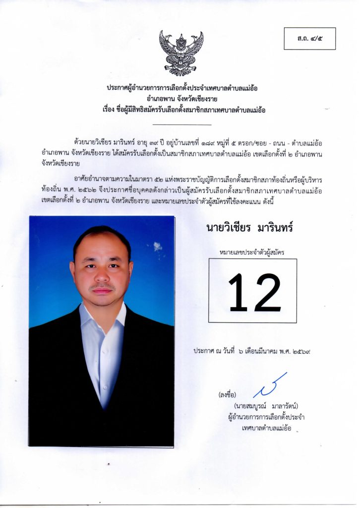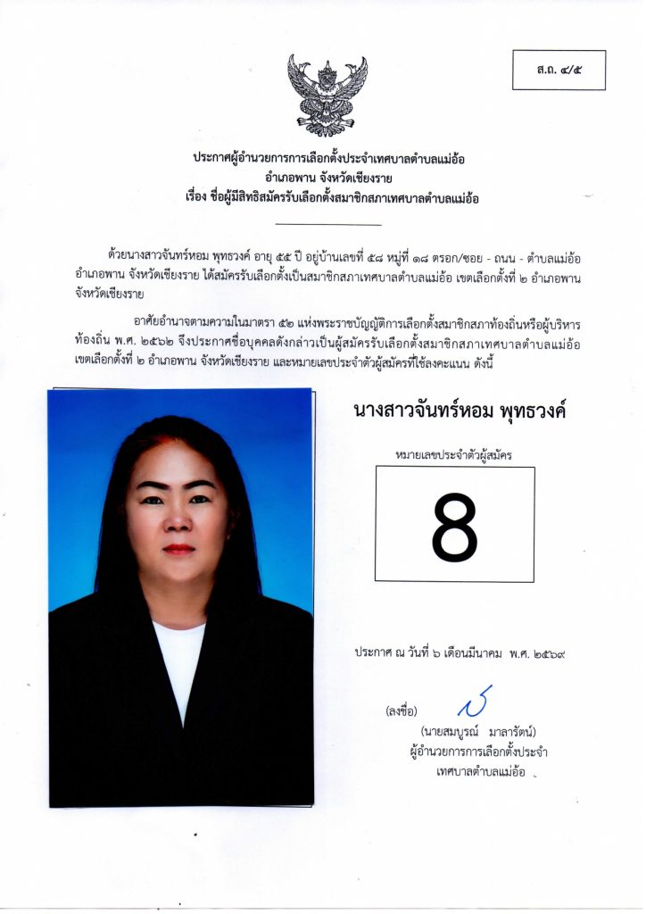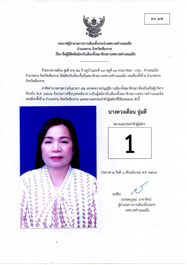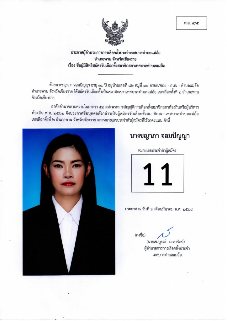 ประกาศผู้อำนวยการการเลือกตั้งประจำเทศบาลตำบลแม่อ้อ เรื่อง ชื่อผู้มีสิทธิสมัครรับเลือกตั้งสมาชิกสภาเทศบาลตำบลแม่อ้อและนายกเทศมนตรีตำบลแม่อ้อลง วันที่ 6 มีนาคม 2569 (ผู้สมัครสมาชิกสภาเทศบาลตำบลแม่อ้อ เขต1)